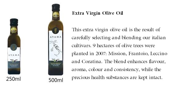 This extra virgin olive oil is the result of carefully selecting and blending our italian cultivars. 9 hectares of olive trees were planted in 2007: Mission, Frantoio, Leccino and Coratina. The blend enhances flavour, aroma, colour and consistency, while the precious health substances are kept intact.