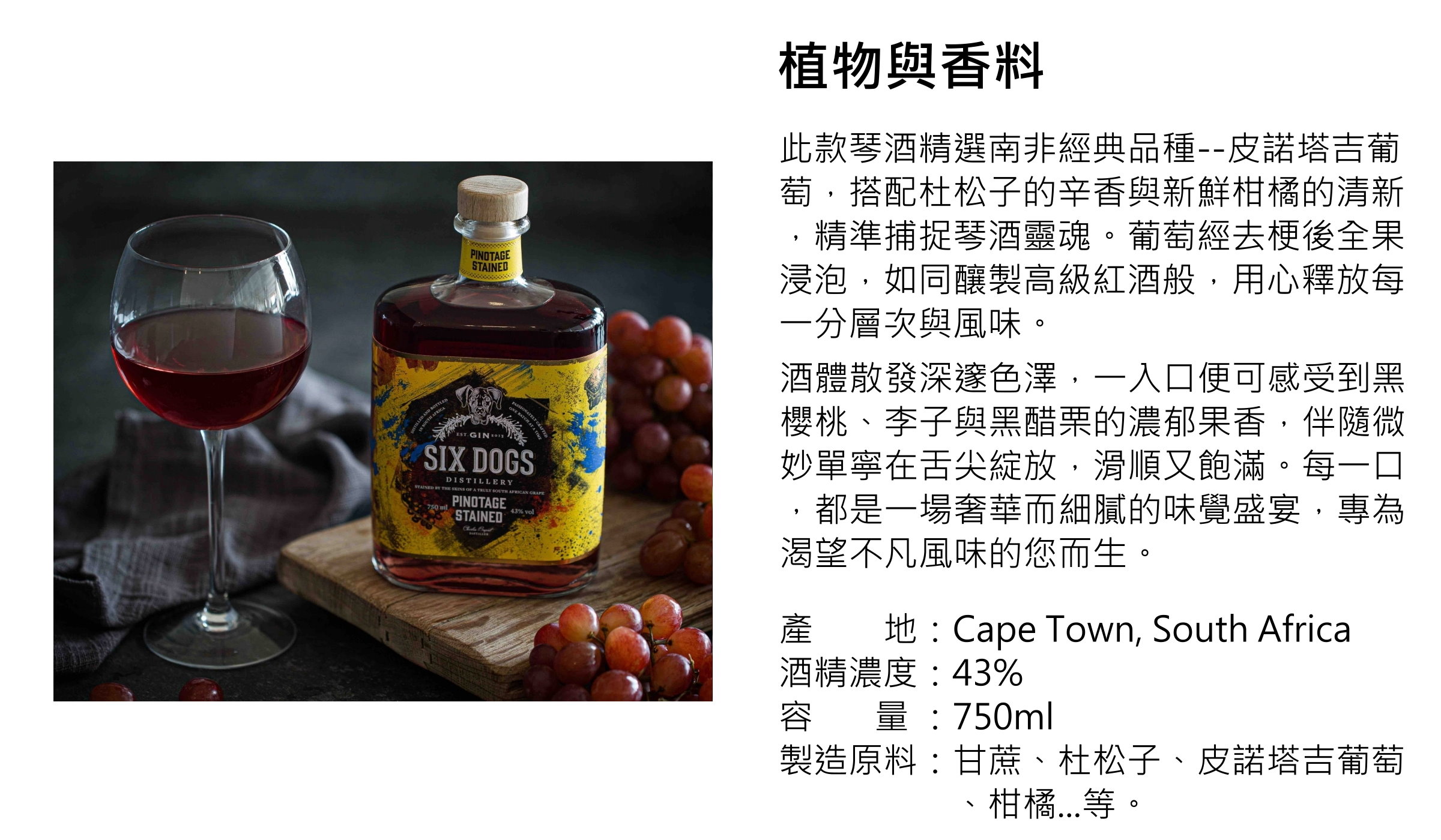 原料:甘蔗、杜松子、皮諾塔吉葡萄、柑橘...等。 *因有浸泡皮諾塔吉葡萄,所以會與紅葡萄酒相似,經長時間後會產生沉澱物,屬正常現象,請安心食用。