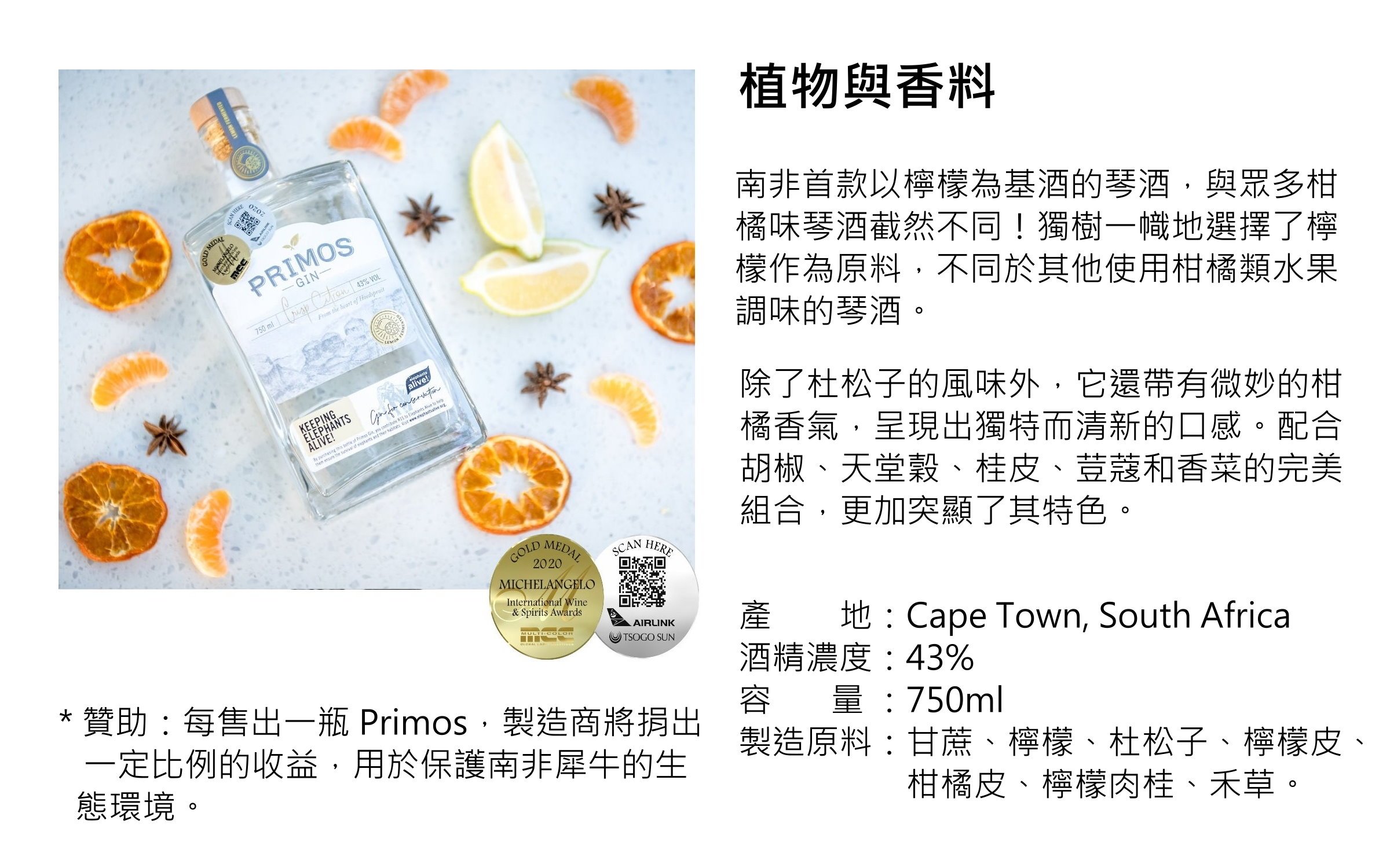 原料:檸檬、杜松子、檸檬皮、柑橘皮、檸檬肉桂、禾草。