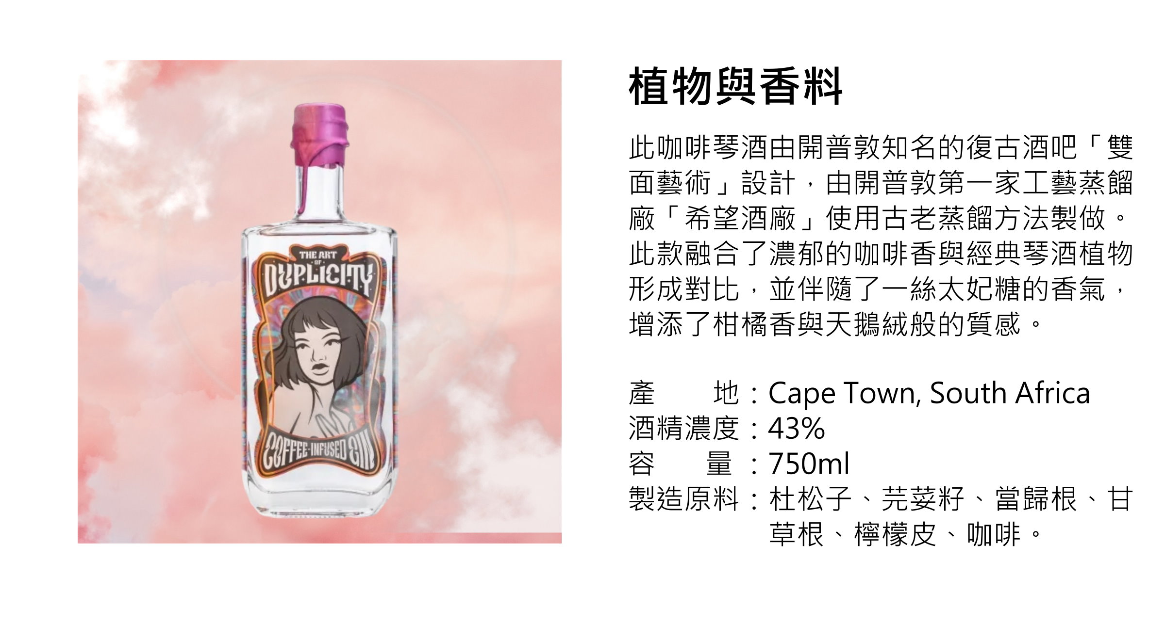 原料:杜松子、芫荽籽、當歸根、甘草根、檸檬皮、咖啡。
